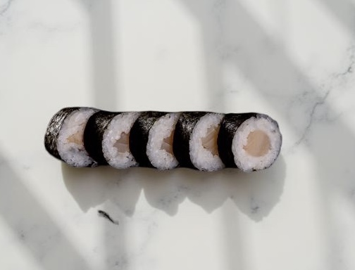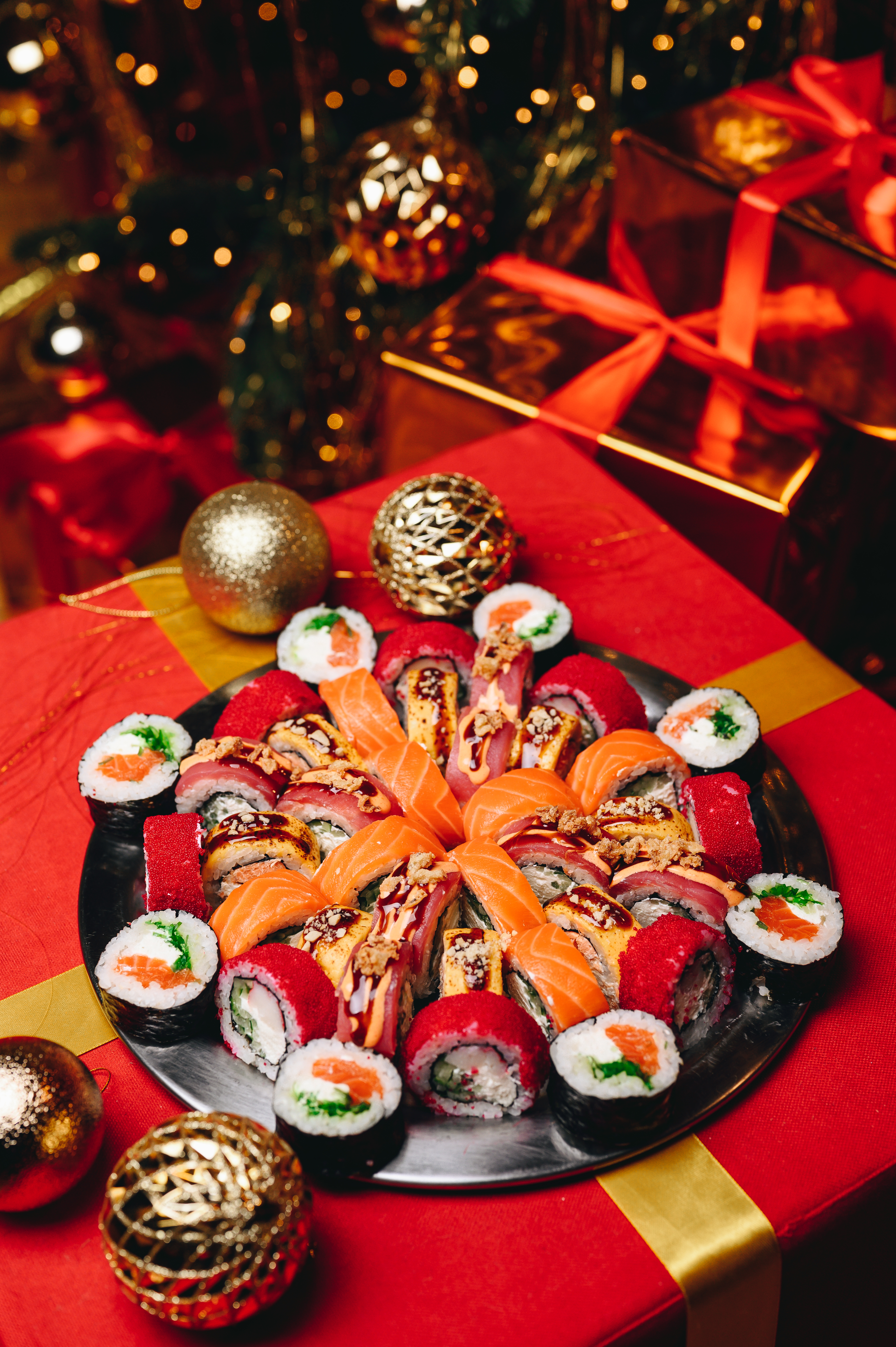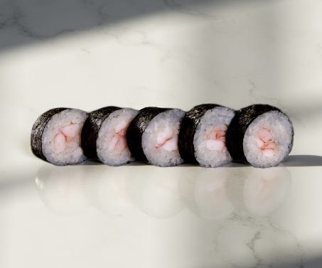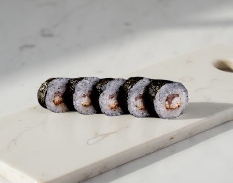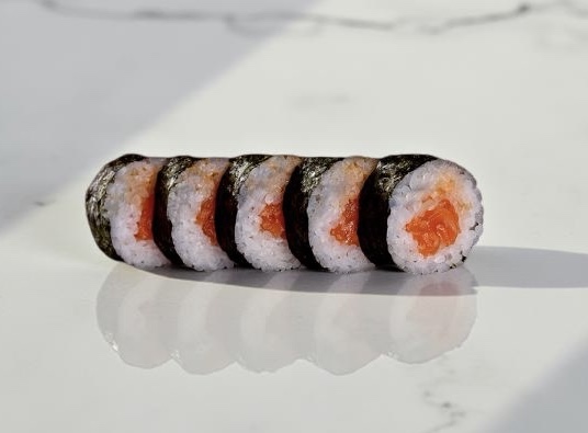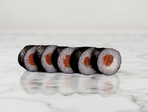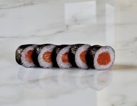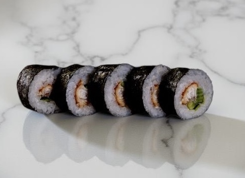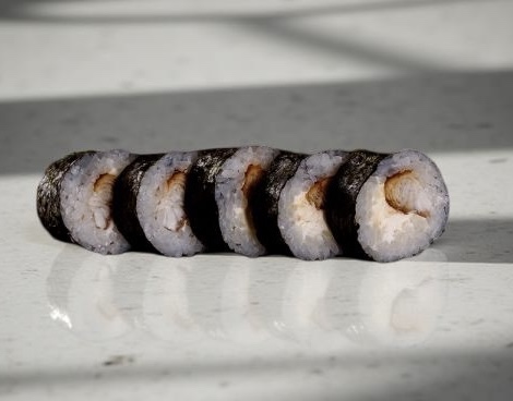 Рол в опаленому чедері, з крем сиром та лососем теріякі ( унагі соус арахіс)